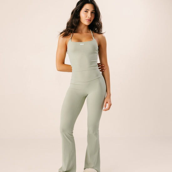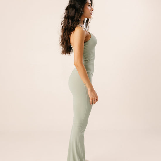 Set de dos piezas con top de silueta femenina y pantalón de tiro alto y bota campana que estiliza y abraza el cuerpo con suavidad.
