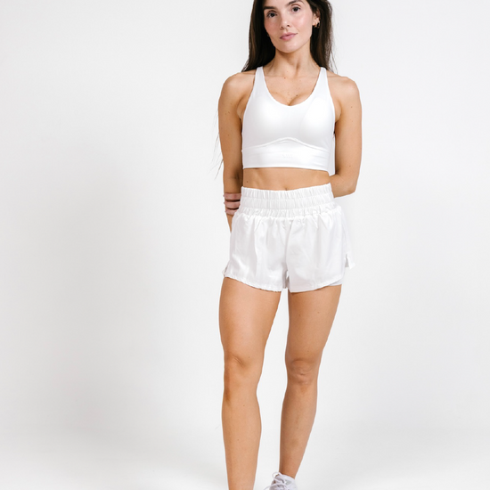 Conjunto deportivo en color blanco. Top de soporte medio y shorts livianos con pretina elástica que brindan mayor comodidad y movilidad para realizar actividades.